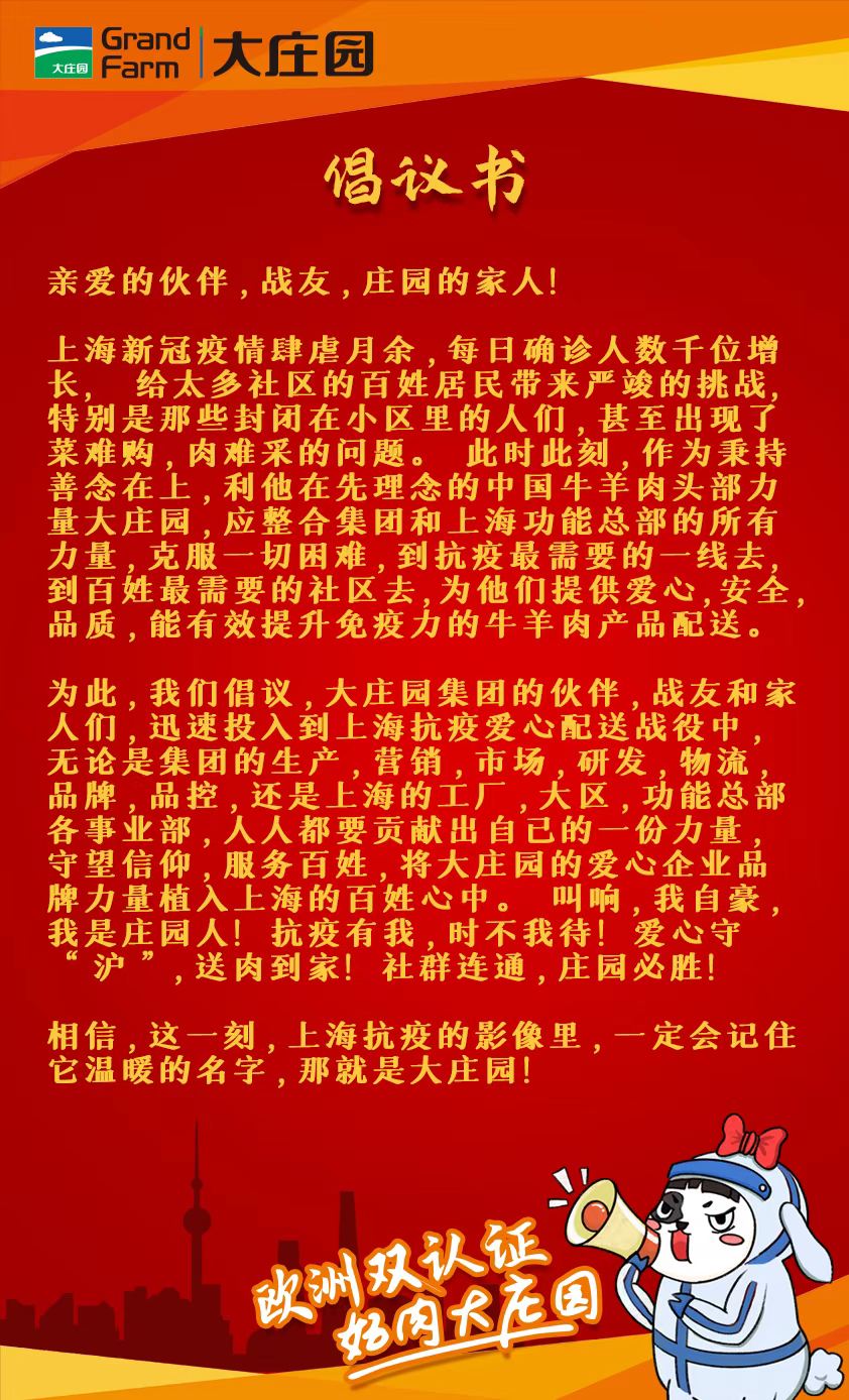 大莊園集團火速成立了“大莊園上海抗疫愛心配送項目組”,并向全集團發出了“共同守“滬” 莊園有我”的倡議書。