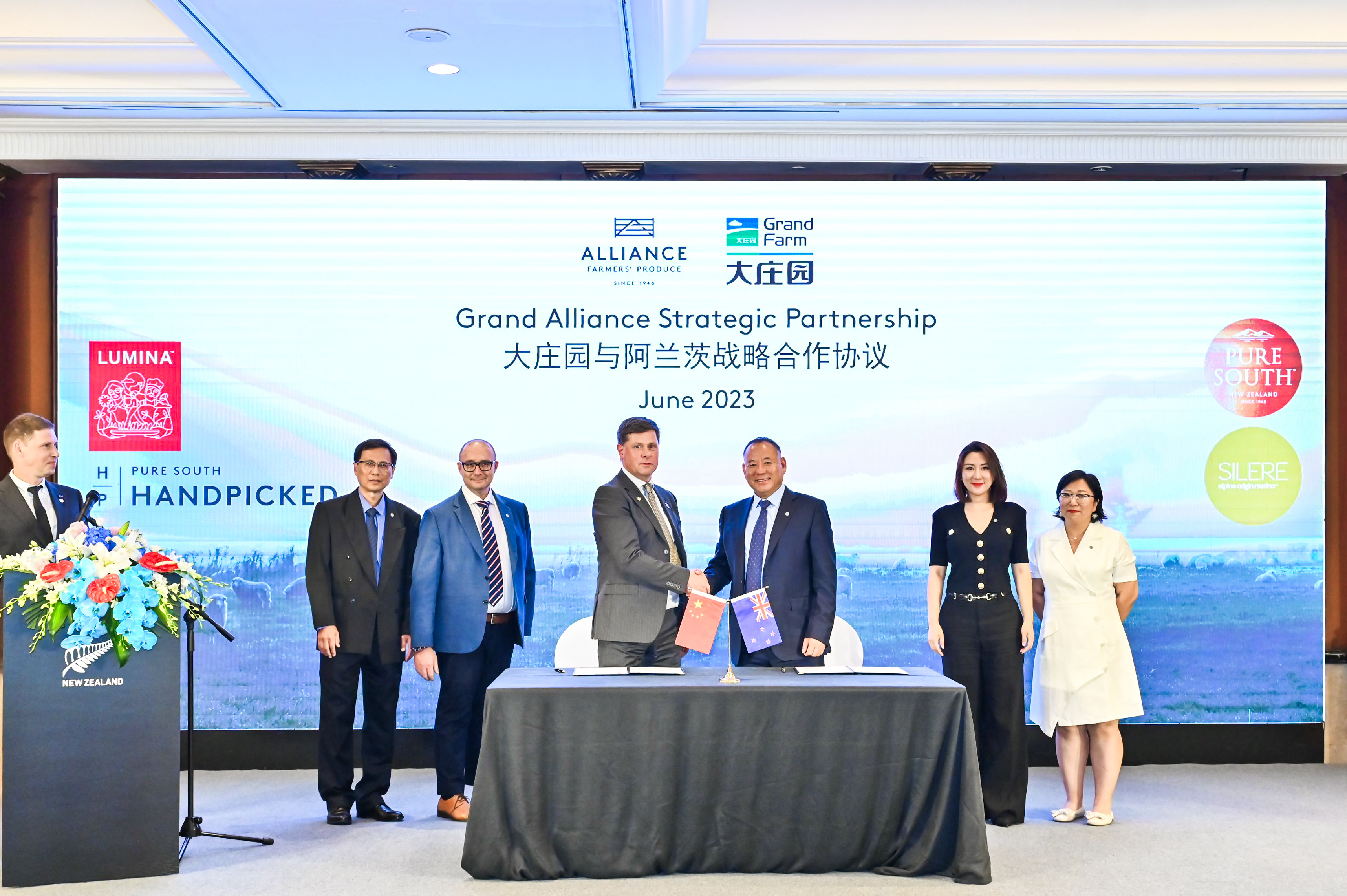2023年6月27日,大莊園集團與新西蘭阿蘭茨集團,在新西蘭總理克里斯·希普金斯的見證下,共同簽署《大莊園與阿蘭茨戰略合作協議》,實現戰略合作全面升級。